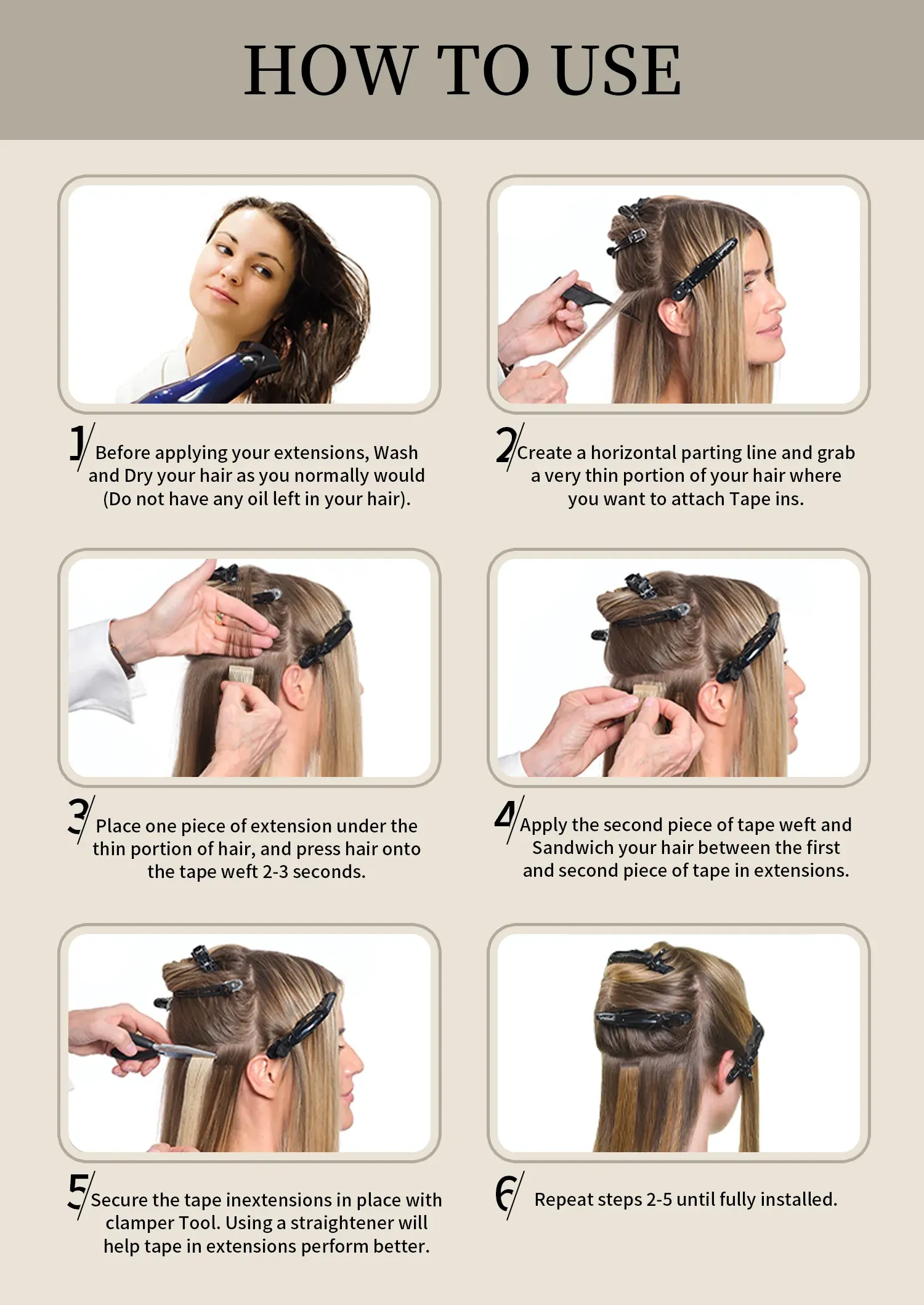- Always remember to shampoo your hair without any conditioner before taping them in as any grease or oil could make the tape slip.